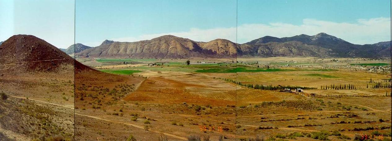 Vista panorámica del valle de Ojos Negros, mostrando el Cerro Doña Eulalia, el Rancho Ojos Negros, el
